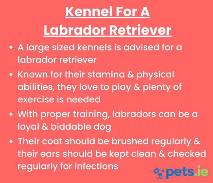 When choosing a kennel for a Labrador Retriever it is important that your dog will have enough space within the kennel to move around comfortably inside. Dogs love to both curl up and stretch out when asleep so always ensure there is room for your dog to do both. We suggest our large dog kennel would be suitable for a Labrador Retriever but always check the measurements against your requirements.