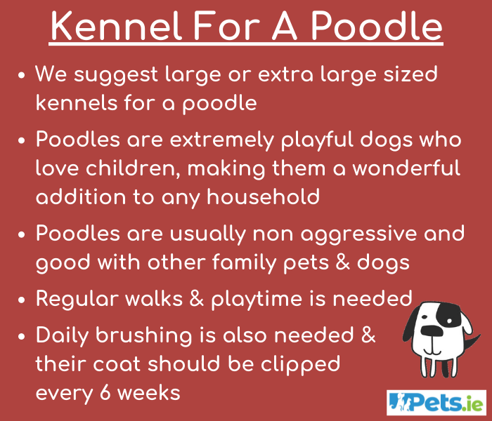 When choosing a kennel for a Poodle it is important that your dog will have enough room to move around comfortably inside. We suggest either our large or extra large dog kennel for a Poodle. Please check the dimensions of both kennels to ensure you choose the correct sized kennel for your dog. Under all of our kennels we have a size guide which should be helpful!