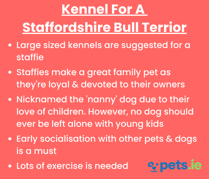 When choosing a kennel for a Staffordshire Bull Terrier it is important that your dog will have enough room to move around comfortably inside. We suggest a large dog kennel for a Staffordshire Bull Terrier. Always check the dimensions of the kennel to ensure you choose the correct sized kennel for your dog.