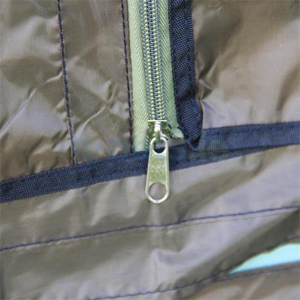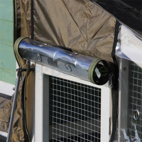 The cover has ventilation holes and rolls up for access for each door, the door cover can be fixed in place when it is rolled up with a velcro attachment to hold it in place, it can be easily rolled back down.