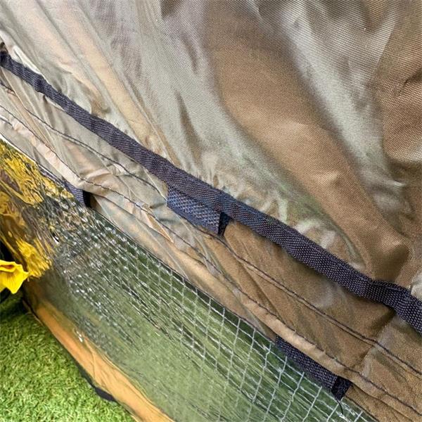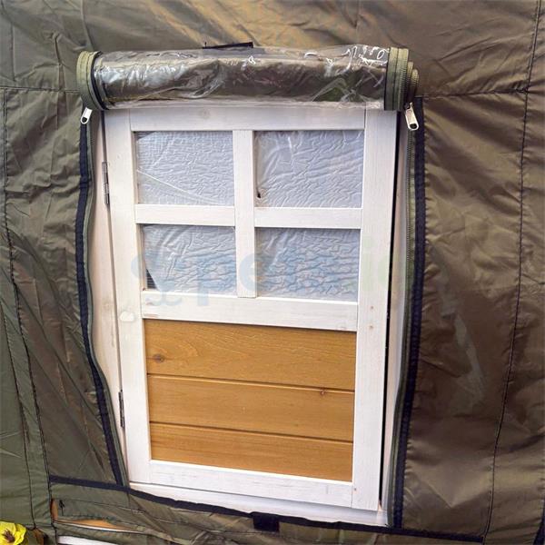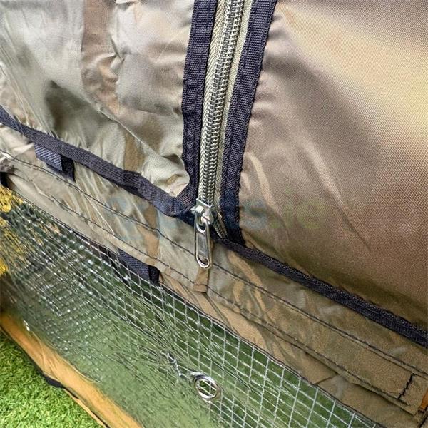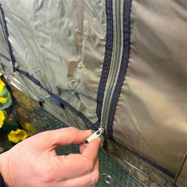 The cover has ventilation holes and rolls up for access for each door, the door cover can be fixed in place when it is rolled up with a velcro attachment to hold it in place, it can be easily rolled back down.